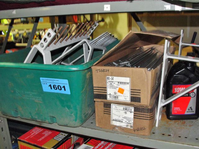 Shelf lot of assorted hardware and 4L of motor oi