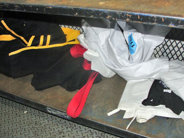 Shelf lot of assorted martial arts uniforms