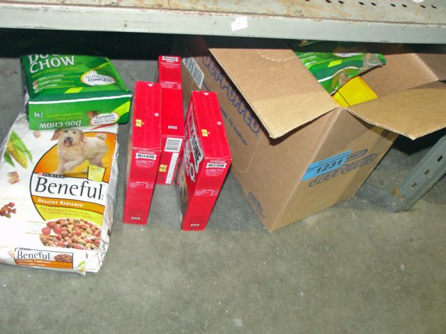 Shelf lot of assorted pet foods and biscuits
