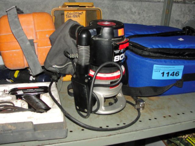 Shelf lot of assorted power tools and misc cases