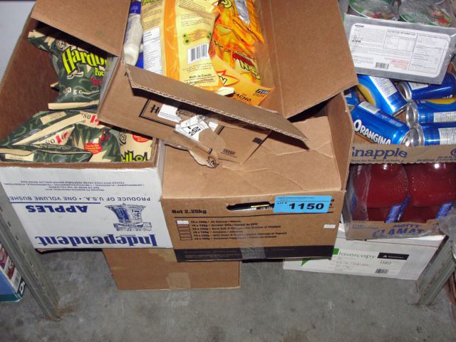 Shelf lot of assorted snack foods, beverages etc