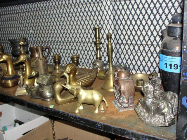 Shelf lot of brasswares, silver plated wares and
