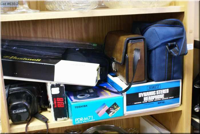 Shelf lot of cameras and camera equipment including Buschnell telescope, Cannon camera, tripod etc.