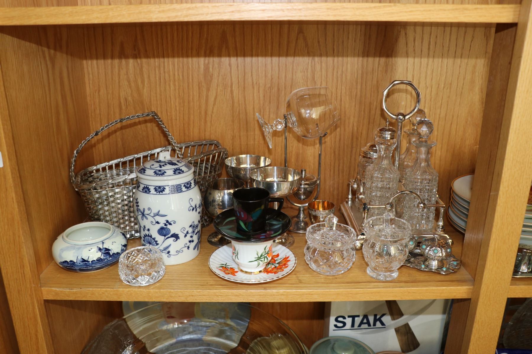 Shelf lot of collectibles including vintage Royal Worcester chocolate set with six lidded cocoa cups, silverplate cruet galley with bottles, brandy snifter with spirit warmer, china demi cups and saucers, shakers, spooners etc.