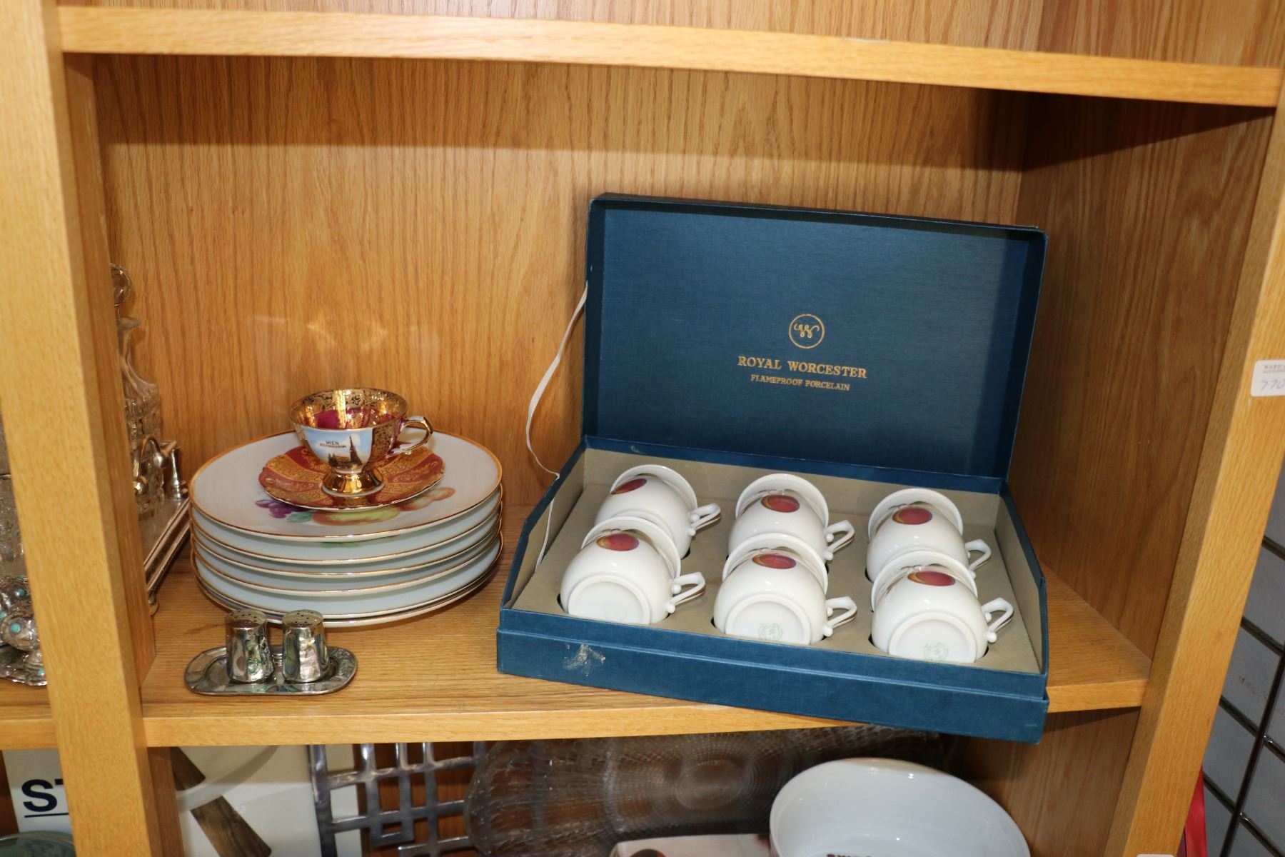 Shelf lot of collectibles including vintage Royal Worcester chocolate set with six lidded cocoa cups
