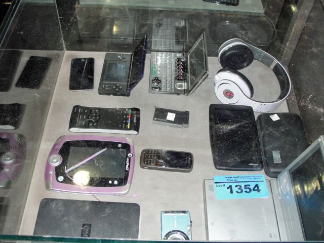 Shelf lot of electronics; GPS, headphones, smart