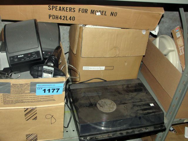 Shelf lot of electronics; speakers, turn table etc