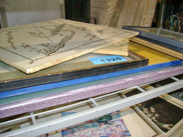 Shelf lot of framed prints and pictures