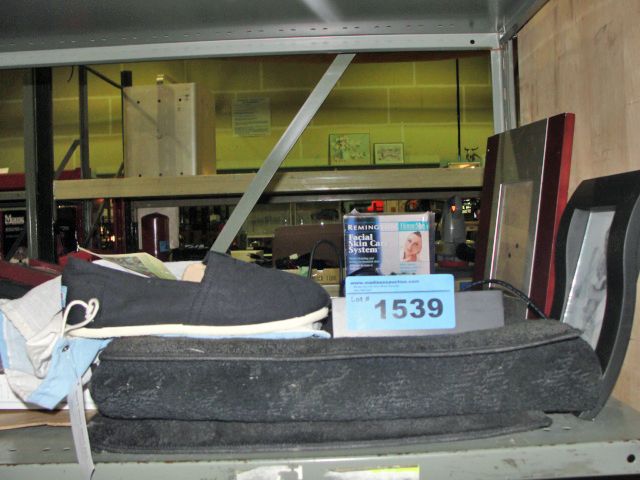Shelf lot of misc frames, exit sign, shoes, etc