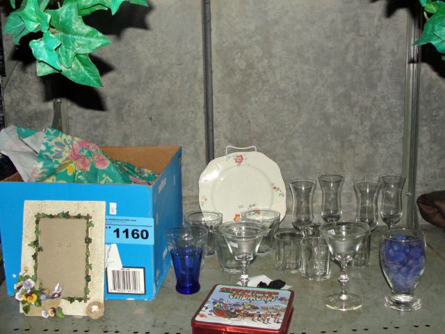 Shelf lot of misc glass ware, picture frames, etc