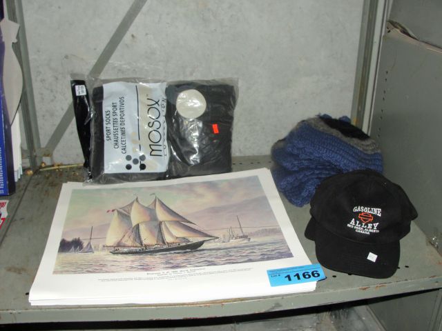 Shelf lot of misc; harley davidson ball caps,