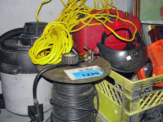 Shelf lot of misc items; jerry can, tire pressure