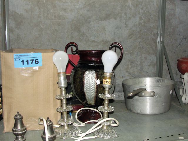 Shelf lot of misc items; lamps, vases, pots, etc
