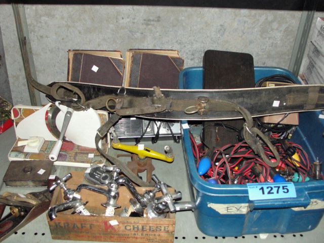 Shelf lot of misc items; tools, vintage faucet tap