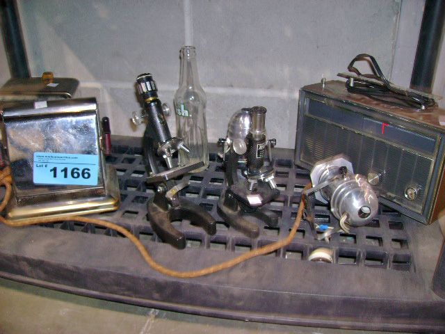 Shelf lot of misc; vintage toaster, microscopes,