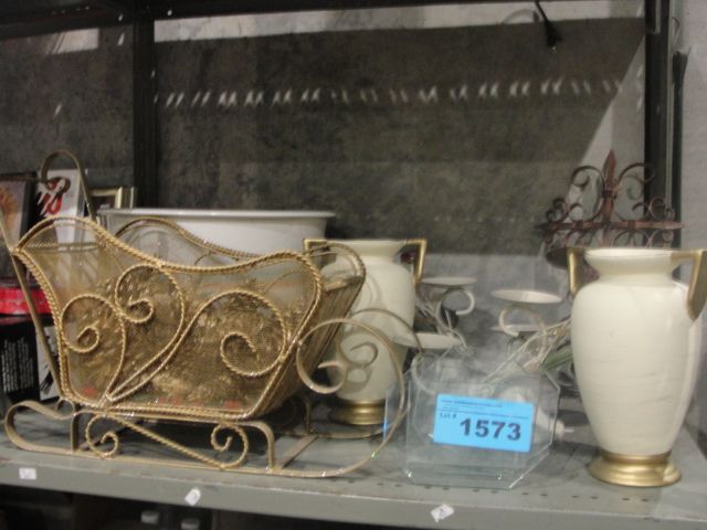 Shelf lot of planters, vases, candle holders etc