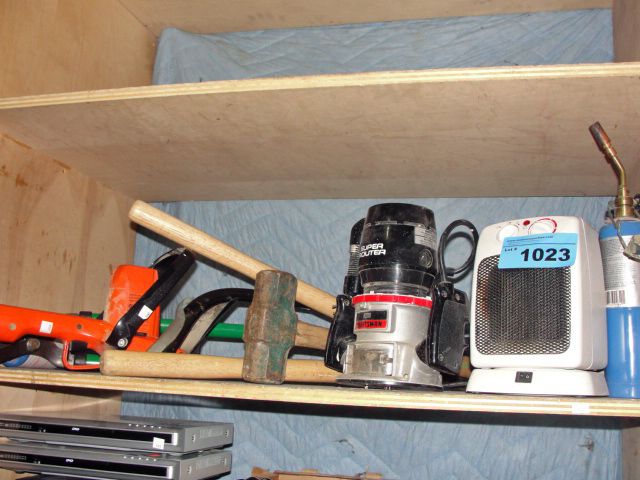 Shelf lot of power tools, hand tools, ceramic