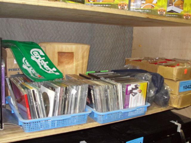 Shelf lot of scented candles, music CDs, misc