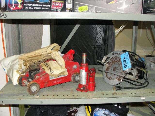 Shelf lot of tools; floor jacks, bottle jack, skil
