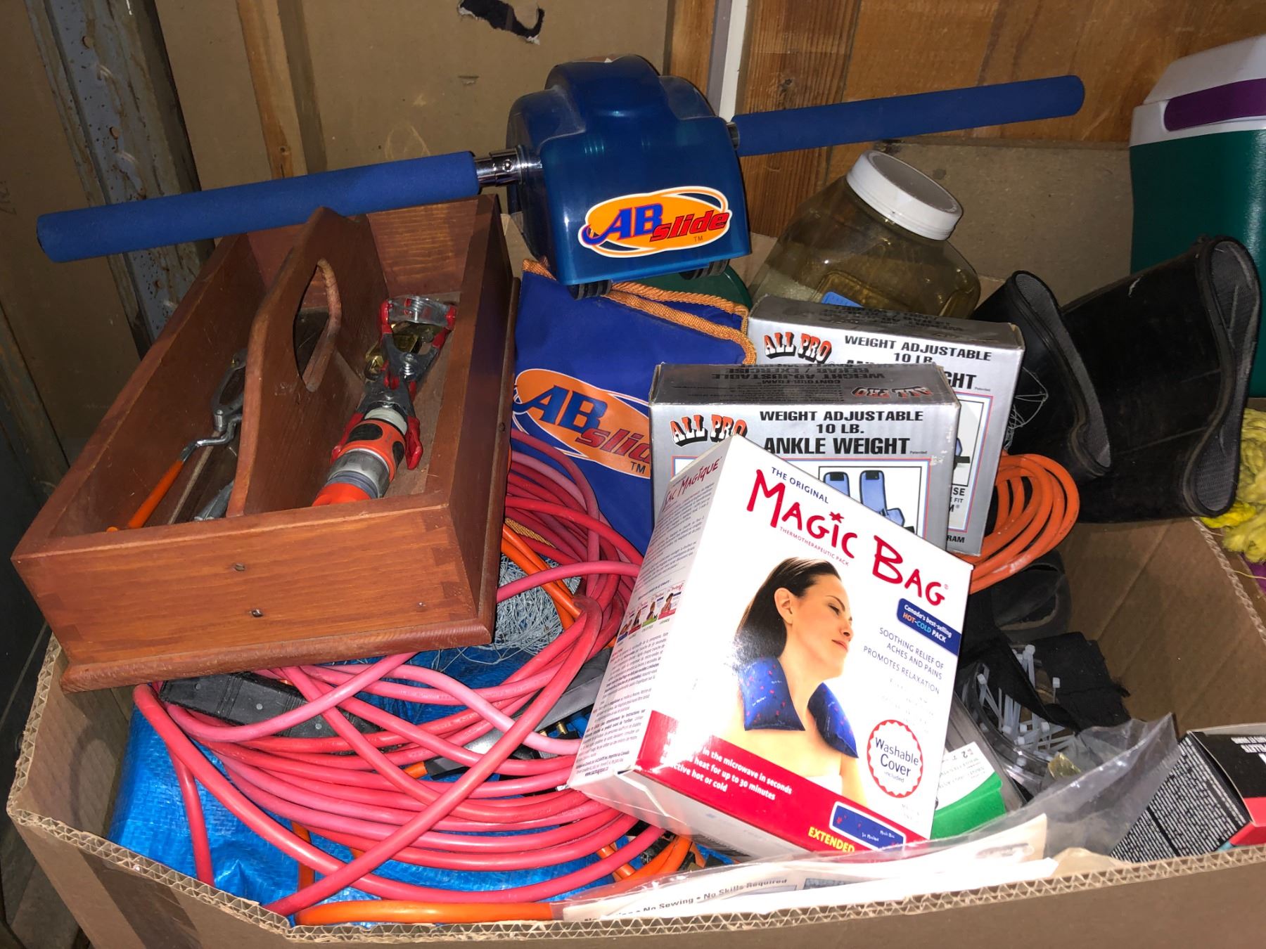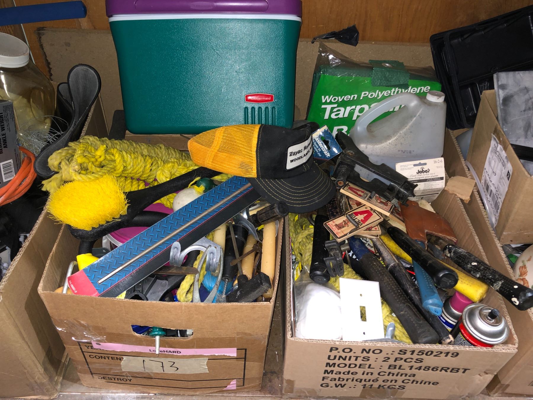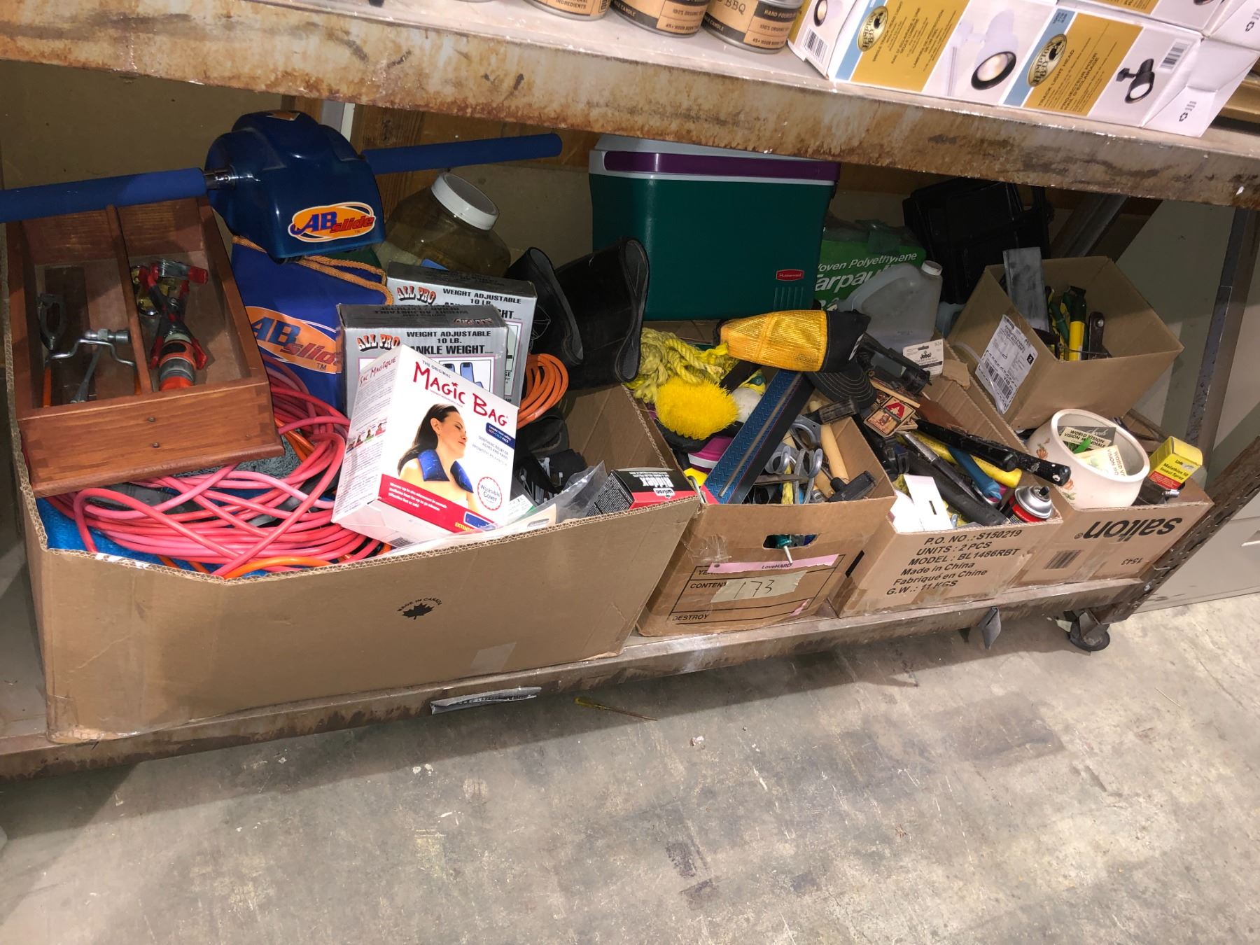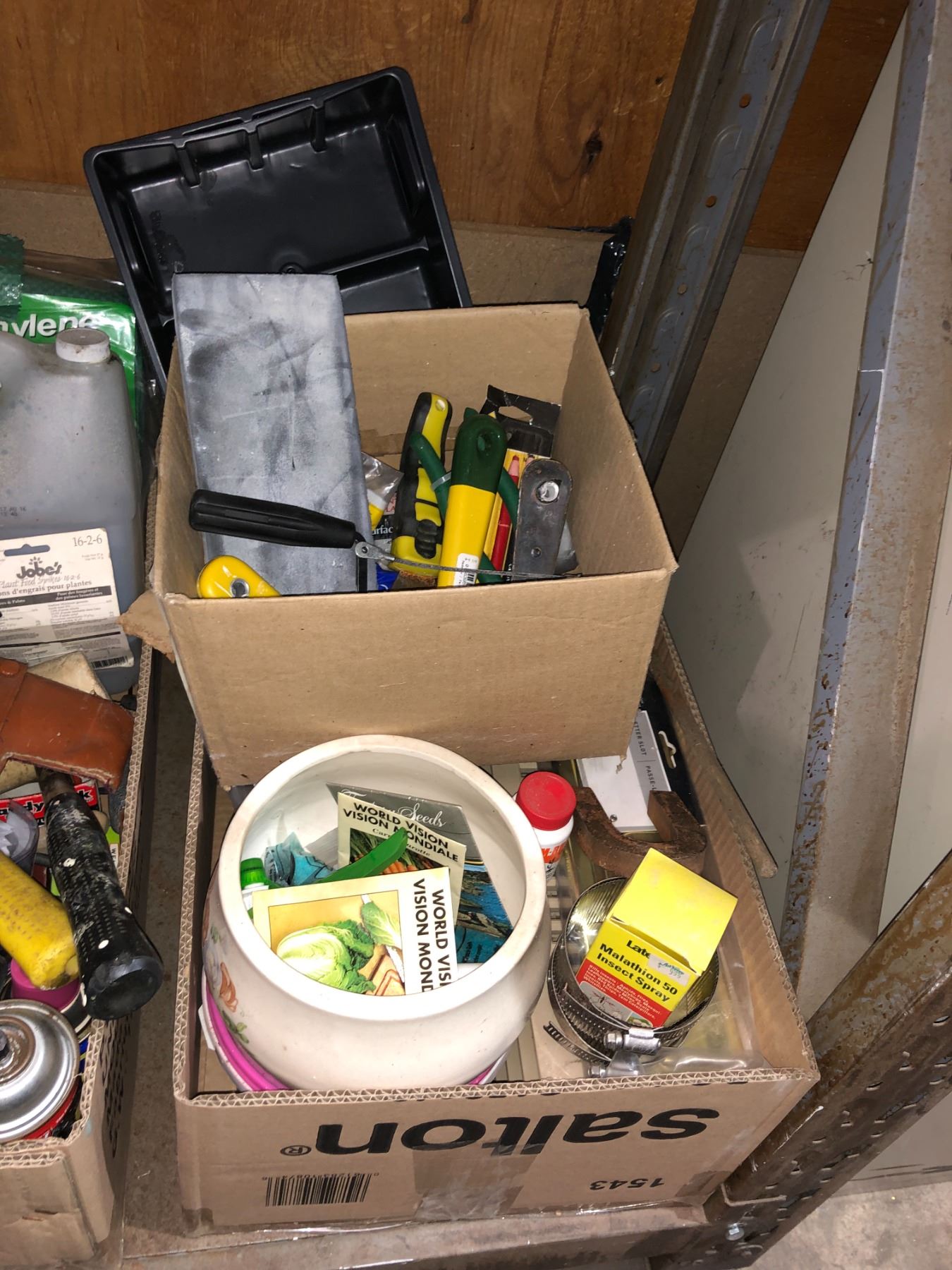 Shelf lot w/5 boxes filled with assorted tools/hardware & misc.