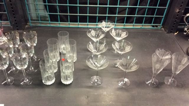 Shelf of etched wine glasses