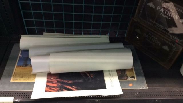Shelf of posters and patron display cases