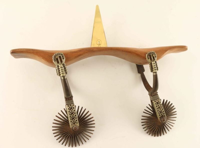 Shelf of natural wood measuring 16 1/4" long holds two dangling large rowel South American spurs. Brass bracket on back to hang shelf.