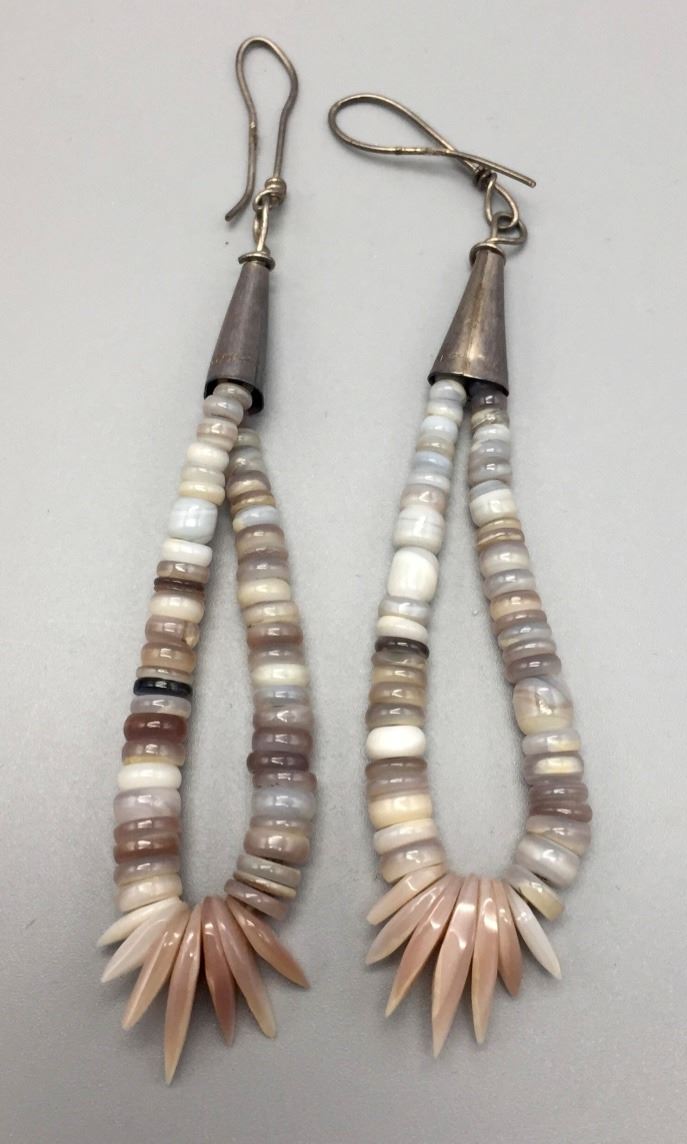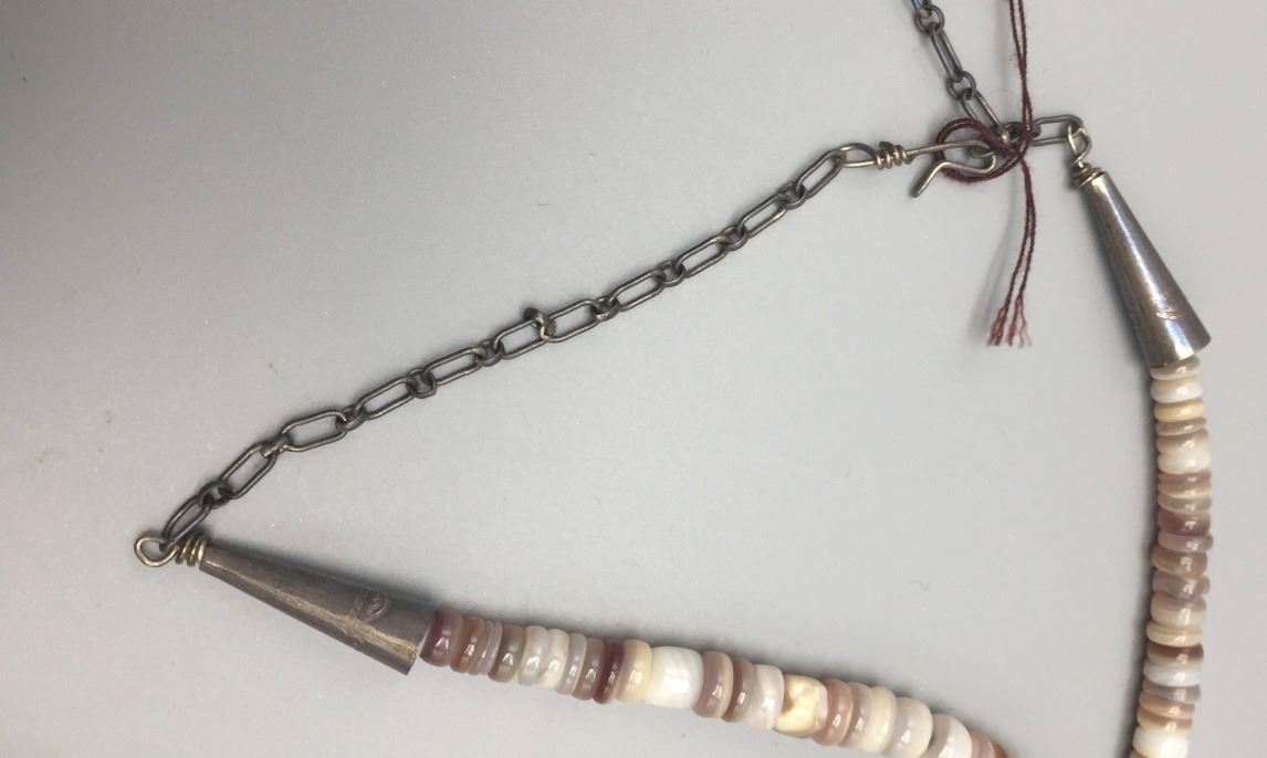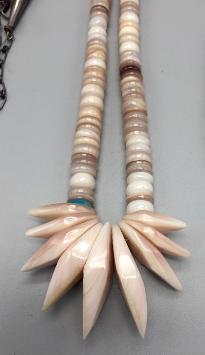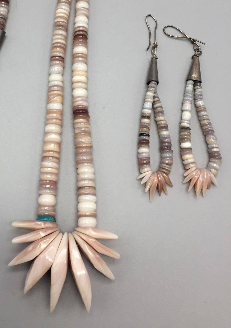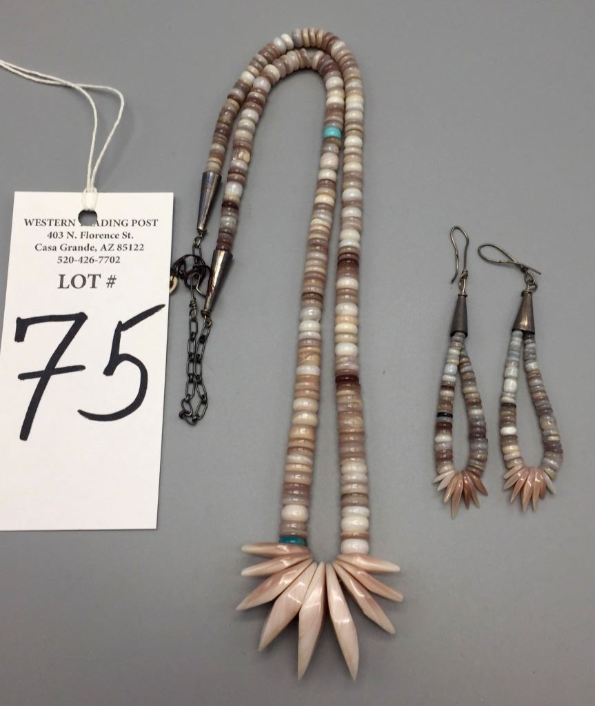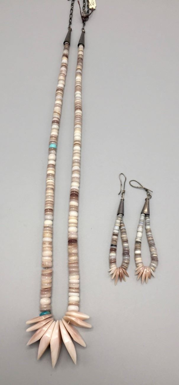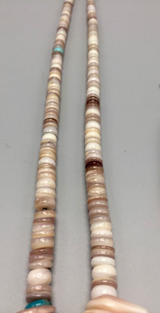 Maker: Unknown. Approx. Age: Circa 1970s. Size: Fits up to 28” around the neck (adjustable). Condition: Good, NOS. Additional Info: Hand-formed shell beads with turquoise accents. Handmade sterling chain enclosure which can be adjusted for size. Comes with earrings. Please look closely at the pictures - they are an important part of our description. Shipping: There will be a $5 handling / packaging fee for shipping this lot. The actual cost of postage will be added on top of that.