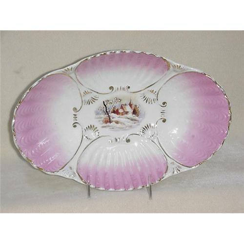 A lovely antique bowl, 13" X 8 1/2". Modeled as four large shells around a central scene, the shells are trimmed in gold and the winter scene is a transfer design with hand painted highlights. Unmarked.