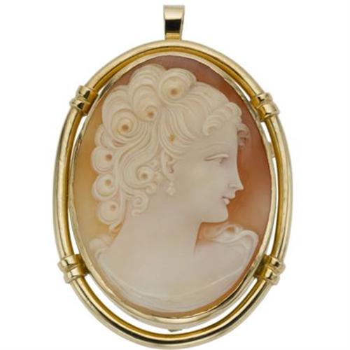 <B>Shell Cameo, Gold Pendant-Brooch</B></I><BR><BR>The pendant-brooch features an oval-shaped shell cameo measuring 40.00 x 30.00 mm, depicting a lady's profile, resting in an 18k yellow gold frame. A retractable bail, pinstem, and catch mechanism complete the reverse. Gross weight 24.50 grams. <BR><I>Dimensions: 2-1/8 inches x 1-7/16 inches (including bail)</B></I> <B>Condition Report:</B> Very good condition.<BR><BR><b>Shipping:</b> Miscellaneous Collectibles, Smal (<a target="_blank" href="http://www.heritageauctions.com/common/shipping.php">view shipping information</a>)