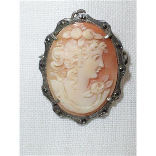 <tr><td>Title:Shell Cameo in Silver Frame with Marcasites </td></tr>