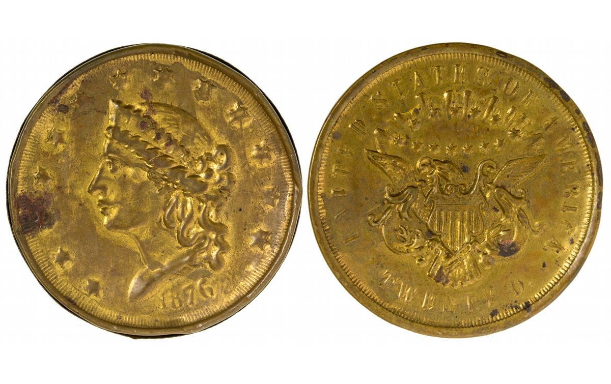 This rare shellcard is made in the style of a US $20 gold, similar to a Type II US $20, but without the motto. The interesting part, though, is the size – it is the same size as a $50 (Wass Molitor size). The piece will undoubtedly be listed in Dave Bowers’ new book on shellcards published by TAMS later this year. The work will be a first describing these unusual tokens made of two pieces of thin metal with a center filled with a cardboard like material. In this manner, a coin like this could have significant weight without the use of 100% metal. In general, US shellcards are so rare, that we’ve only offered a handful of them over the past three decades. This piece may be considered a “gaming counter” for use in card games (because of its similarity to a US $20), particularly in saloons. - HKA#64832