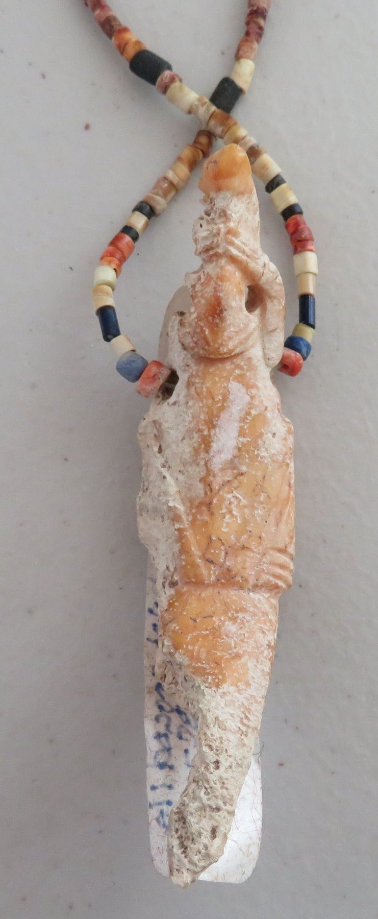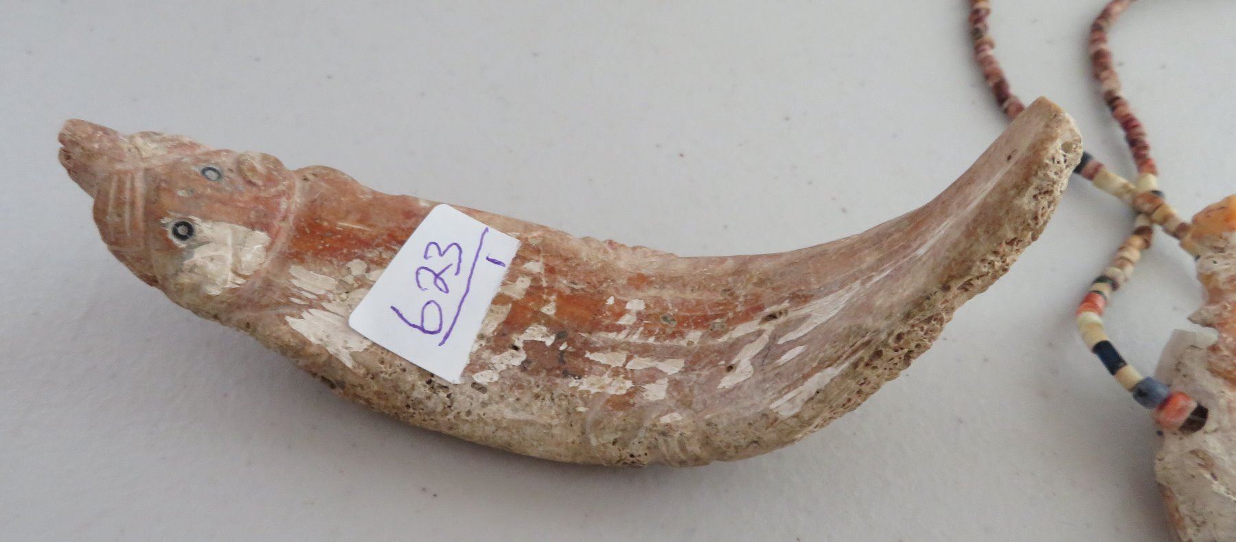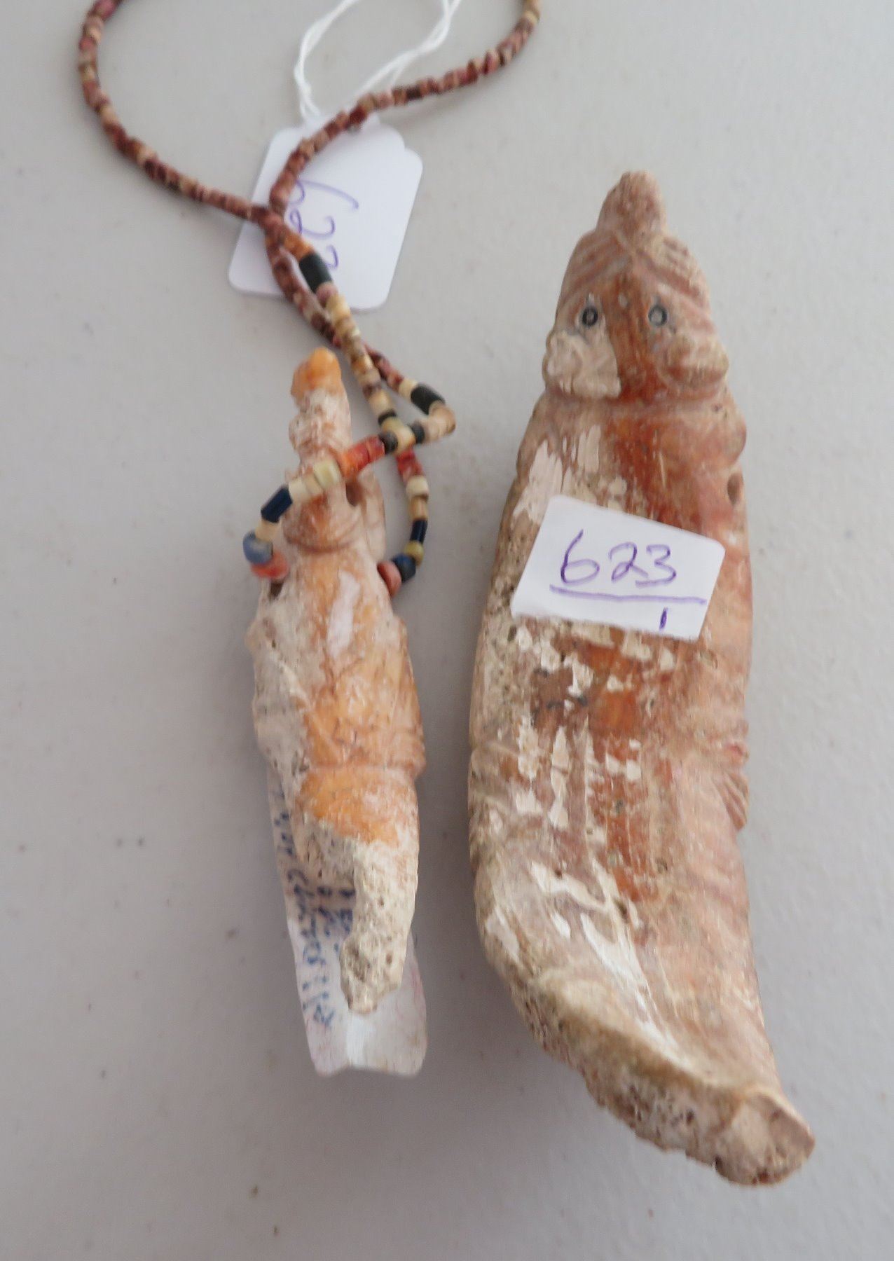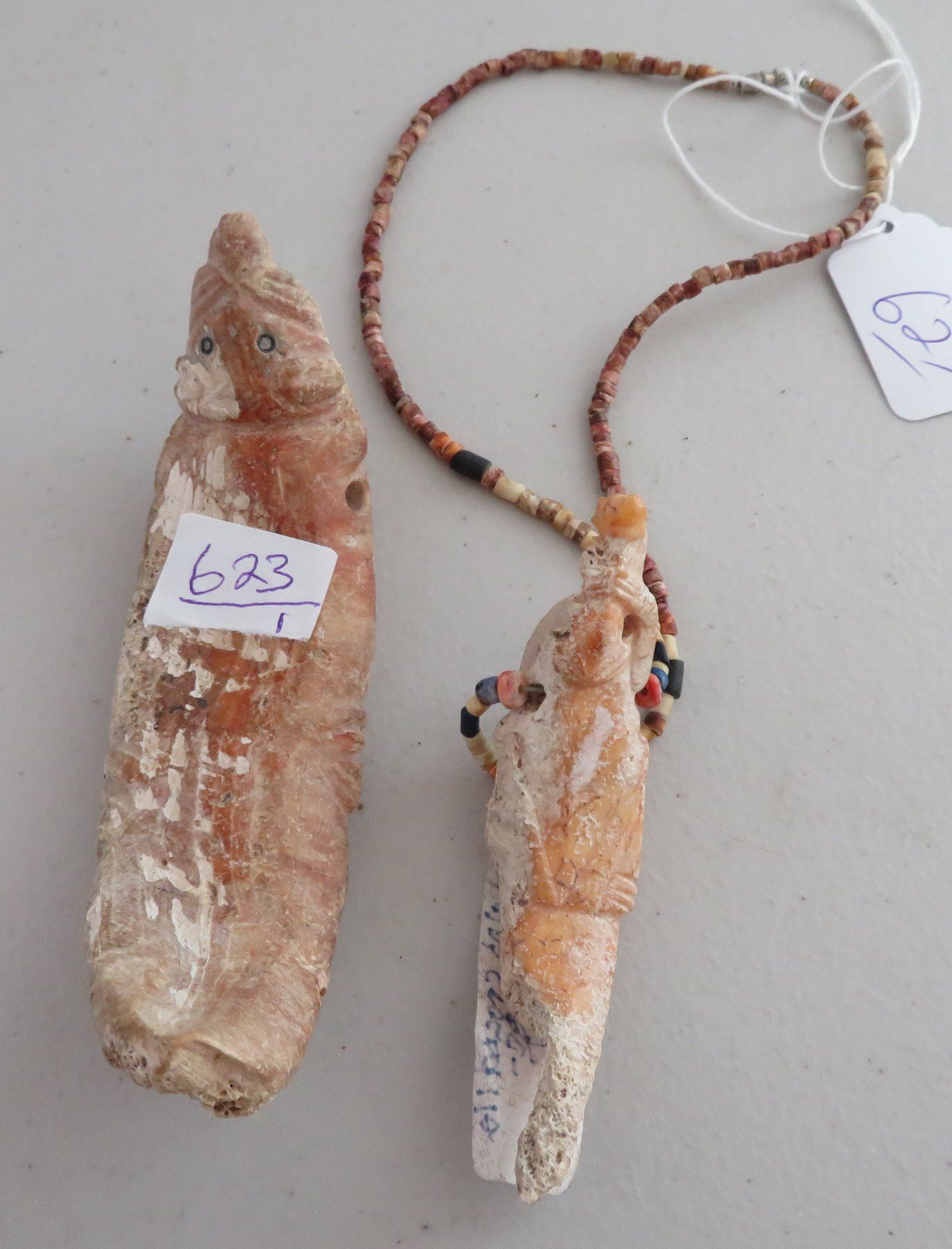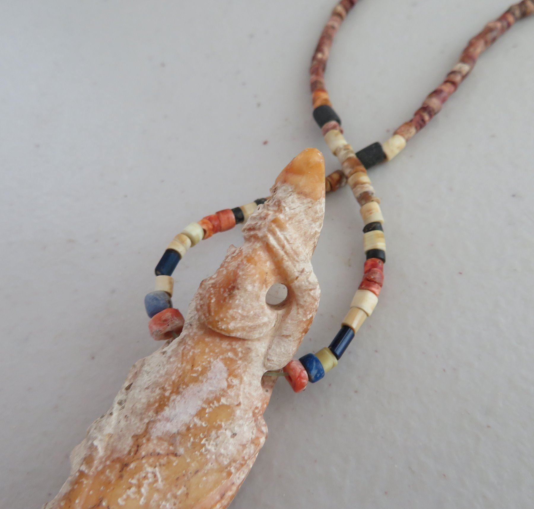 Shell Carving & Beads, pre-Columbian items. Made of shell and stone, the necklace measures 16" and the pendant 5". Inlaid eyes on pendant. Colima, Mexico. Condition: Wear and erosion, see images. Shipping: $16.50 w/insurance and signature.
