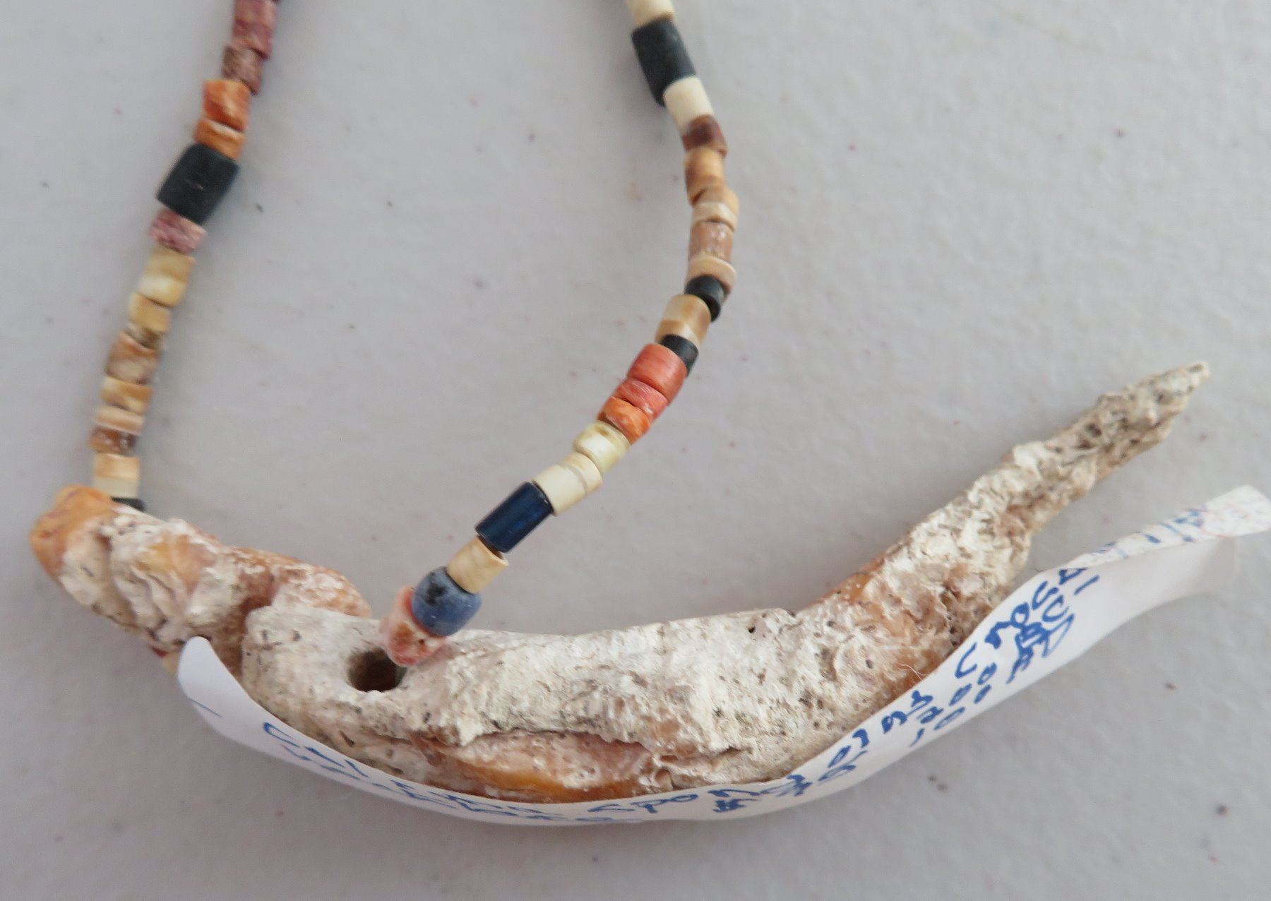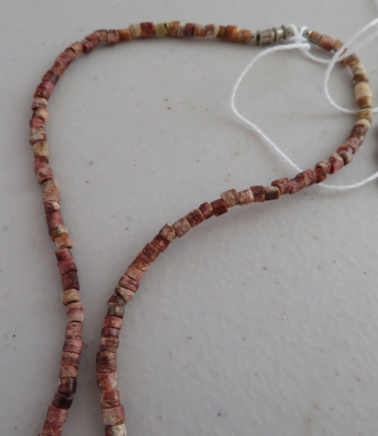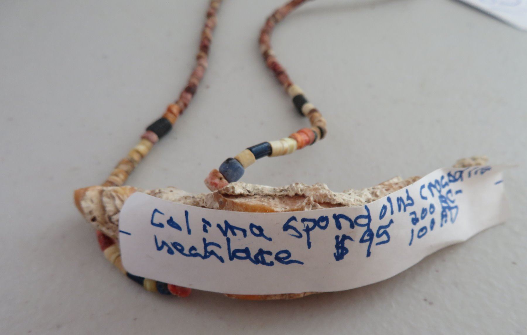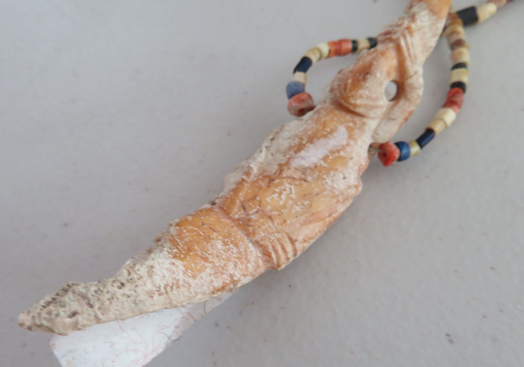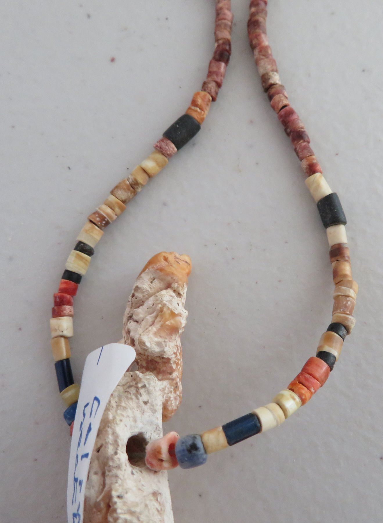 Shell Carving & Beads, pre-Columbian items. Made of shell and stone, the necklace measures 16" and the pendant 5". Inlaid eyes on pendant. Colima, Mexico. Condition: Wear and erosion, see images. Shipping: $16.50 w/insurance and signature.