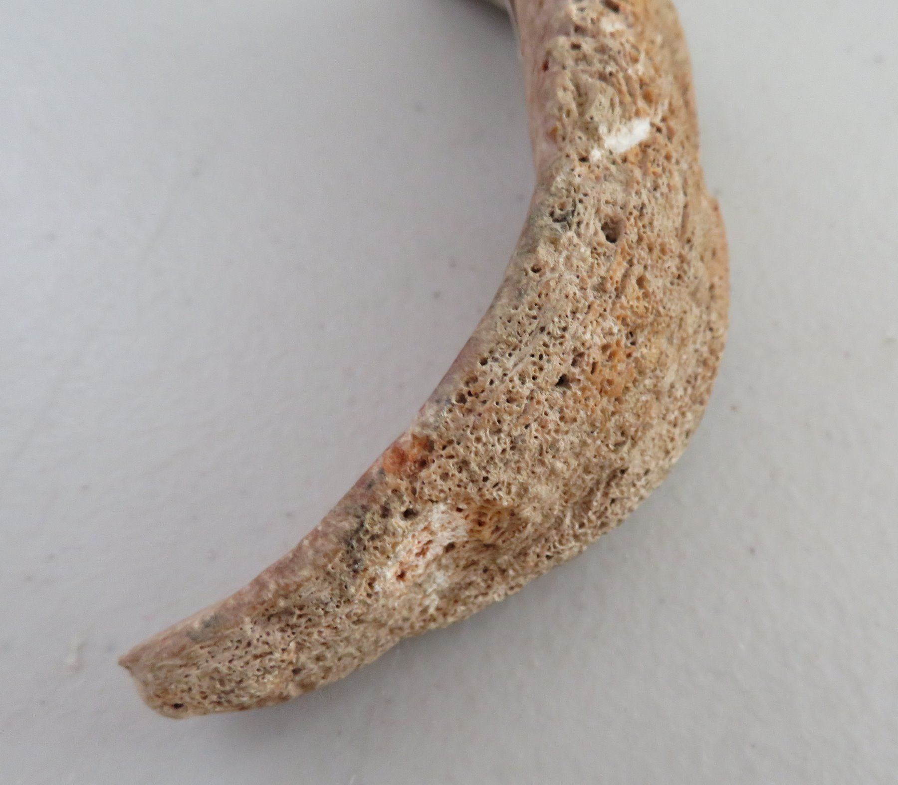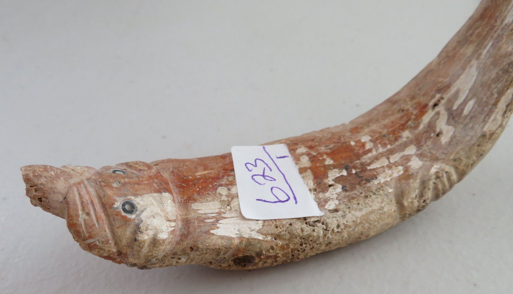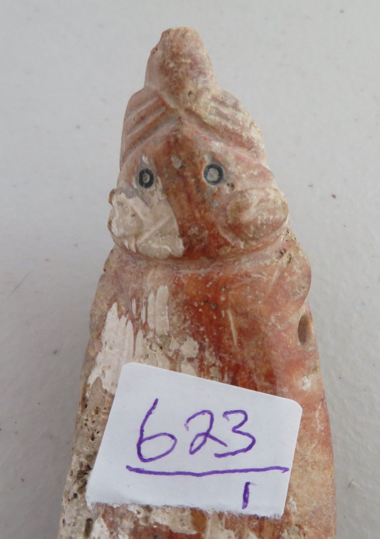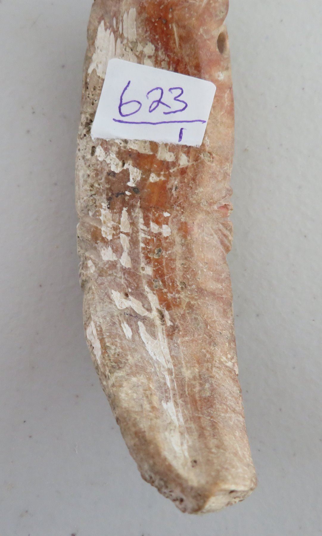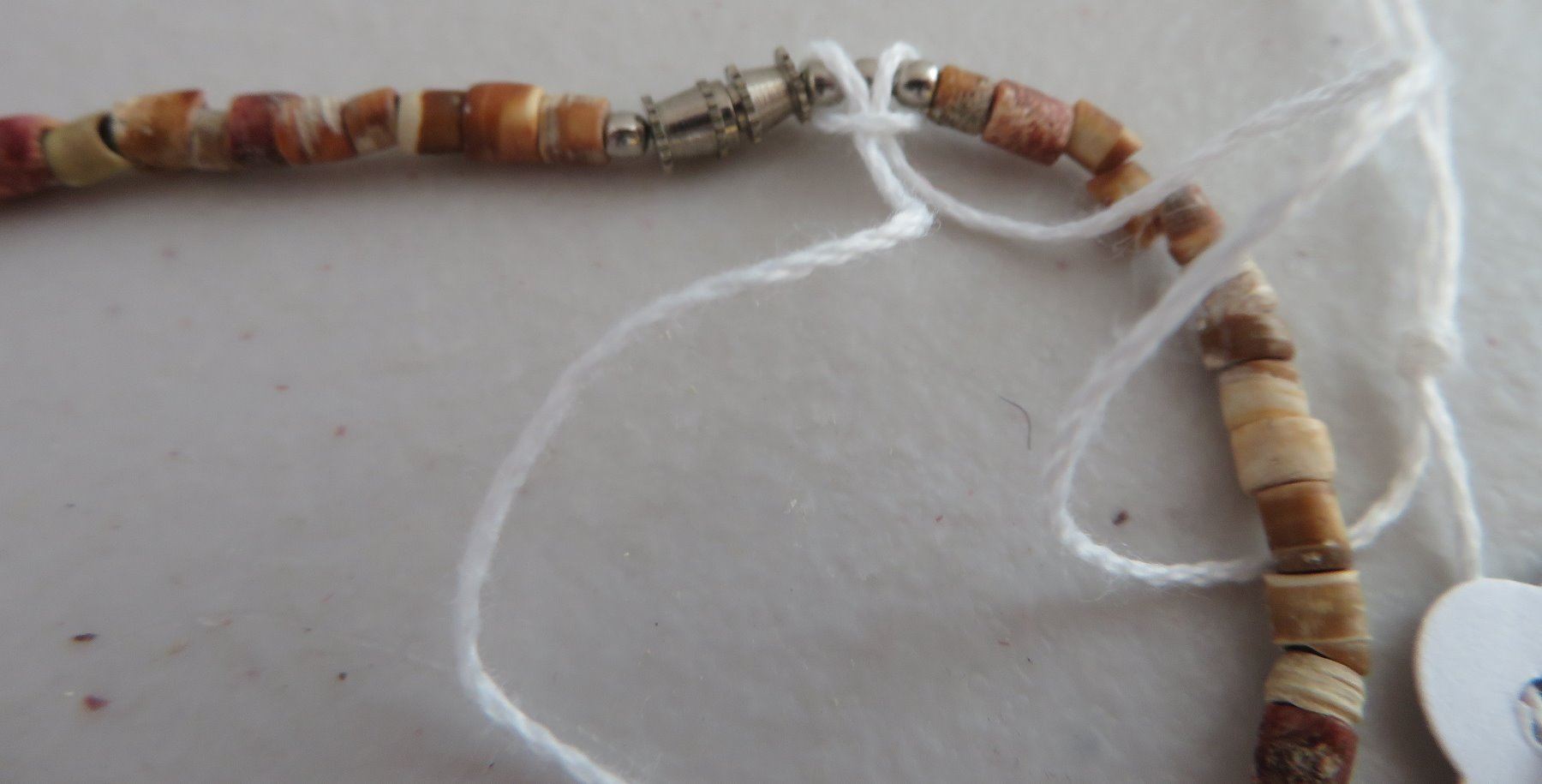 Shell Carving & Beads, pre-Columbian items. Made of shell and stone, the necklace measures 16" and the pendant 5". Inlaid eyes on pendant. Colima, Mexico. Condition: Wear and erosion, see images. Shipping: $16.50 w/insurance and signature.