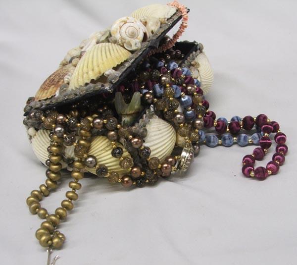 Shell Covered Jewelry Box And Jewelry Plus. 8 Necklaces, longest measures approx. 30''. 2 watches and 2 stone burrows. Buyers Pay Actual Shipping and Handling Charges(see terms and conditions for more information).
