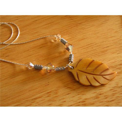 Tiny snake chain on which sets silk color Swarovski and light colorado topaz color ab crystal bi-cones with licorice twist Bali sterling silver as spacers, free floating, with a beautiful caramel shell leaf.<p>Beautiful detail. This necklace measures 17 inches.And closes with a sweet little lobster claw clasp. 1.5 in. leaf.<p>Classy enough for any occasion, any Outfit.<p>A must see to appreciate!