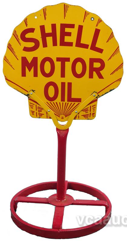 Shell Motor Oil Double Sided Porcelain Curb Sign - 24" x 25" On Original Stand - 47" Tall