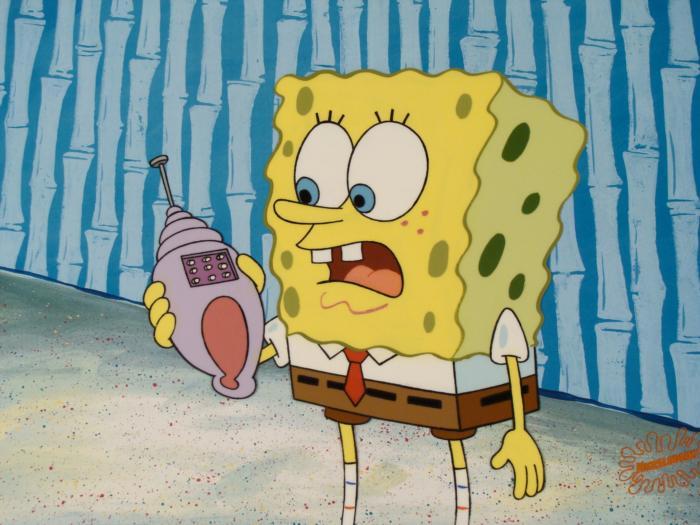 This animation cel and reproduction background are from the Nickelodeon TV show SpongeBob Squarepants. The story takes place under the deep blue sea in Bikini Bottom, where SpongeBob resides. SpongeBob, who is a yellow, porous sponge, is your typical happy-go-lucky character, as he is always cheerful and enjoys making people laugh. Patrick Star, SpongeBob's neighbor who is a starfish, is your average children's show idiot, as he boasts knowing nothing and is often getting himself into ridiculous situations. Between the homes of these two lies the home of the miserable Squidward, a squid, who is known for being grouchy and playing tricks on SpongeBob and Patrick. Both SpongeBob and Squidward work at the Krusty Krab, a fast food business run by the greedy money-loving Mr. Krabs, a crab, the arch rival of the evil, possibly misunderstood, Plankton. Another neighbor, Sandy Cheeks, an athletic squirrel who normally wears an astronaut's space suit, was introduced in "Tea at the Treedome." She spends most of her time inventing and experimenting. SpongeBob is calling on his shell phone.Original Printed Background and Animated Cel Overall Size of Background: 10 1/2" x 17" Overall Size of the Cel: 10 1/2" x 12 1/2" Very good condition This is an original hand-painted cel set-up used in the production of an episode of "SpongeBob SquarePants." Each one-of-a-kind set-up represents a slight change in position of the characters. When individually photographed and projected in rapid succession, the images appear to move.