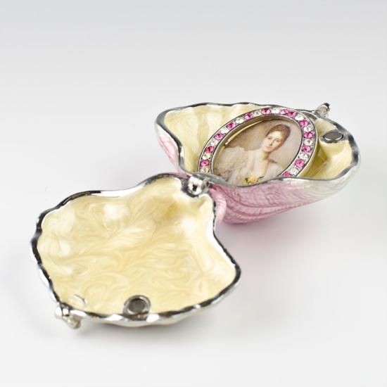 Shell Picture Frame Faberge Jewelry Box, Dimensions: 2.5in (D), Material: Pewter, Crystals, Enamel. This jewelry box has picture frames, which is hidden inside.
