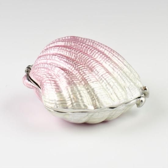 Shell Picture Frame Faberge Jewelry Box, Dimensions: 2.5in (D), Material: Pewter, Crystals, Enamel. This jewelry box has picture frames, which is hidden inside.