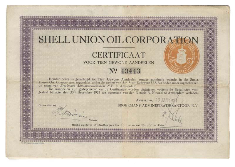 1931, Amsterdam. Stock certificate. Orange Dutch imprinted revenue. A nice Dutch certificate for ownership in one of America’s most well-known oil companies. Fine.