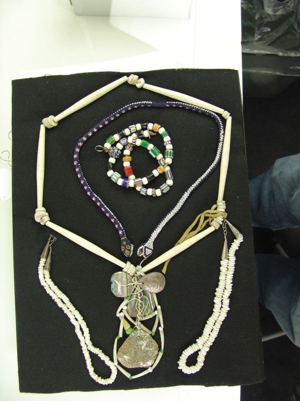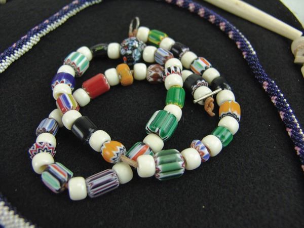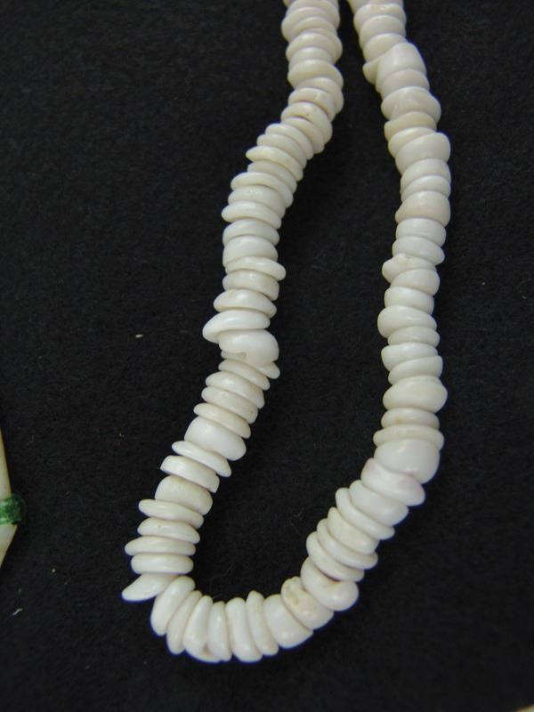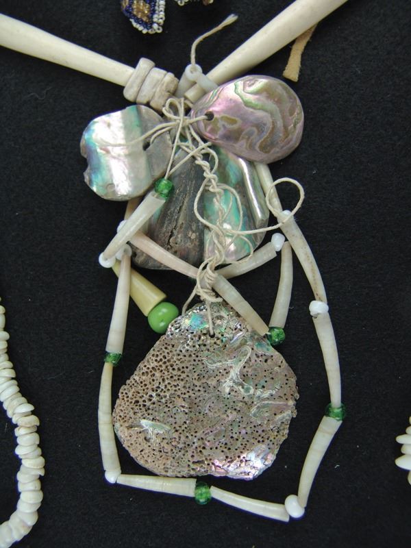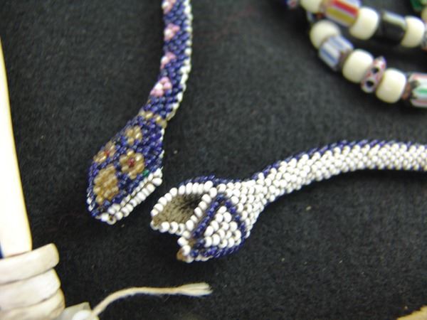 Display with a great, older, restrung Pomo bone and shell necklace, a Yaqui fully beaded, two-headed snake, two 1970s puka shell chokers, and a small bead necklace. All in very good condition.