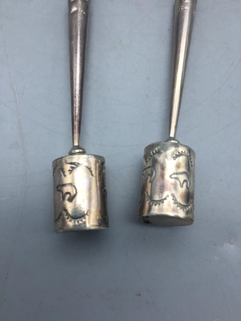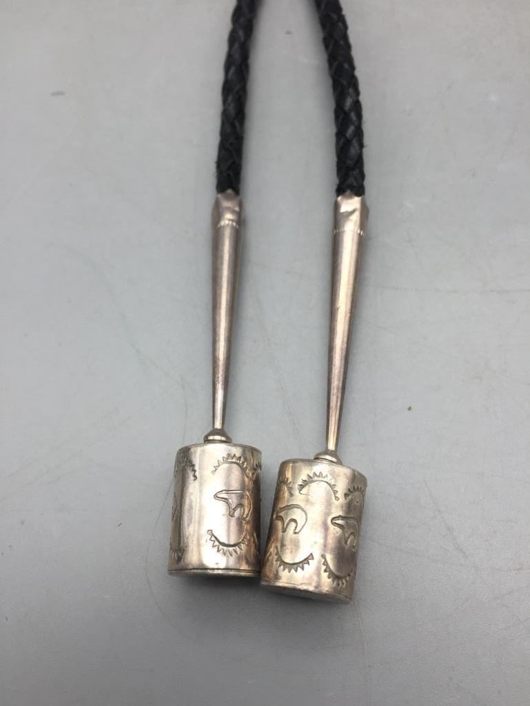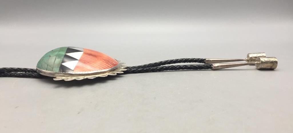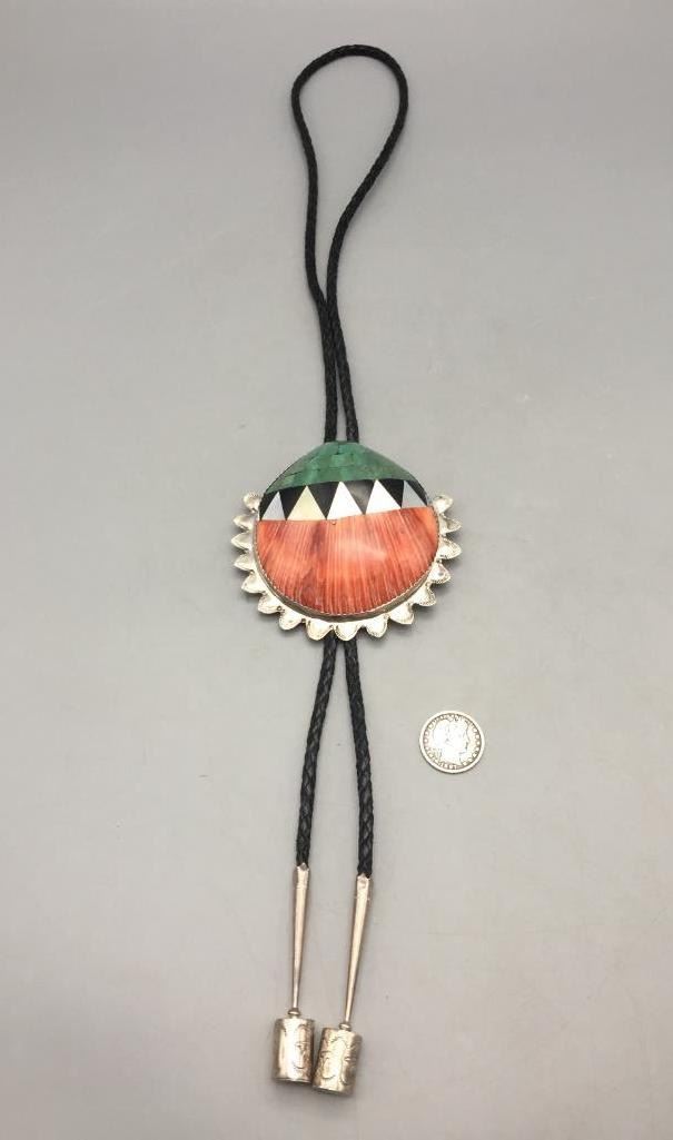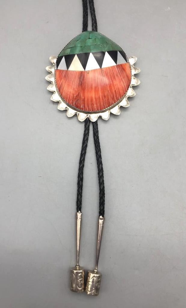 Description: Presented for sale in this lot is a shell and sterling silver bolo tie by Matt Coriz. It is a beautiful large shell with an inlay design that is set with turquoise, shell, onyx on a spiny oyster shell. Marked sterling silver. Maker: Matt Coriz (1953-; Kewa). Active since 1960s. Approx. Age: Circa 1980s or later. Size: Braided cord measures 44 inches long. Slide measures 3-3/4 inches wide X 3-3/4 inches long. Weighs 125.1 grams. Condition: Good for its age, normal wear expected. Please look closely at the pictures - they are an important part of our description. Shipping: There will be a $5 handling / packaging fee for shipping this lot. The actual cost of postage will be added on top of that.