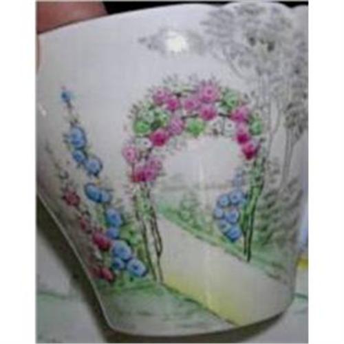 Vintage charm is reflected in Shelley's Archway of Roses pattern on their early Cambridge produced for Ideal China.<p>Three bone china pieces consisting of tea cup, saucer and tea plate are in near excellent condition. Superb diminuative motif of florals and formal garden archway entrance. Shape, Trademark and RD 823343, in addition to the Ideal China stamp and painted pattern number narrows production to 1937 - 1945. Very good condition with some minor rim rub and gilt wear.
