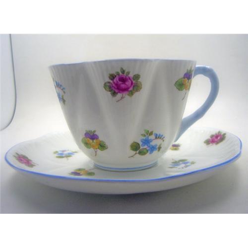 Roses, Pansies and Forget Me Nots, Floral Sprays on white background. Blue Edge and handle. Entered in the pattern books in 1940, Pattern No 13424. Another beautiful Shelley Dainty Cup and Saucer Set. Saucer measures 5 5/8 approx.