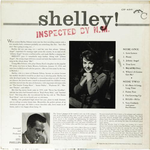<B>Shelley Fabares "Shelley!" LP Colpix 426 Stereo (1962).</B></I> Mono was still the norm in 1962, which makes this stereo copy a real find, especially in this grade. Teenage darlin' Shelley looks oh-so-pretty on the front, and the record demonstrates fantastic stereo sound quality. The back cover has some pencil markings and an "INSPECTED BY N.M." stamp. Condition: EX 7/ NM 8.<BR><BR><b>Shipping:</b> Recordings (<a target="_blank" href="http://www.heritageauctions.com/common/shipping.php">view shipping information</a>)