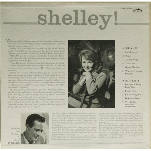 <B>Shelley Fabares "Shelly!" Stereo LP Colpix 426 (1962).</B></I> On the heels of her mega-'60s hit "Johnny Angel" and capitalizing on her popularity as arguably the biggest star on TV's "The Donna Reed Show", this album was released. It wasn't nearly the success of the single or the TV show, and, consequently is pretty rare -- especially so in stereo. Nice pictures of the extremely photogenic Miss Fabares on both covers, helped by the condition of this immaculate copy. And that goes for the disc, too! Condition: MT 9/ MT 9. <I>From the GRT Collection</B></I>