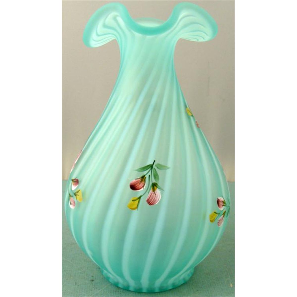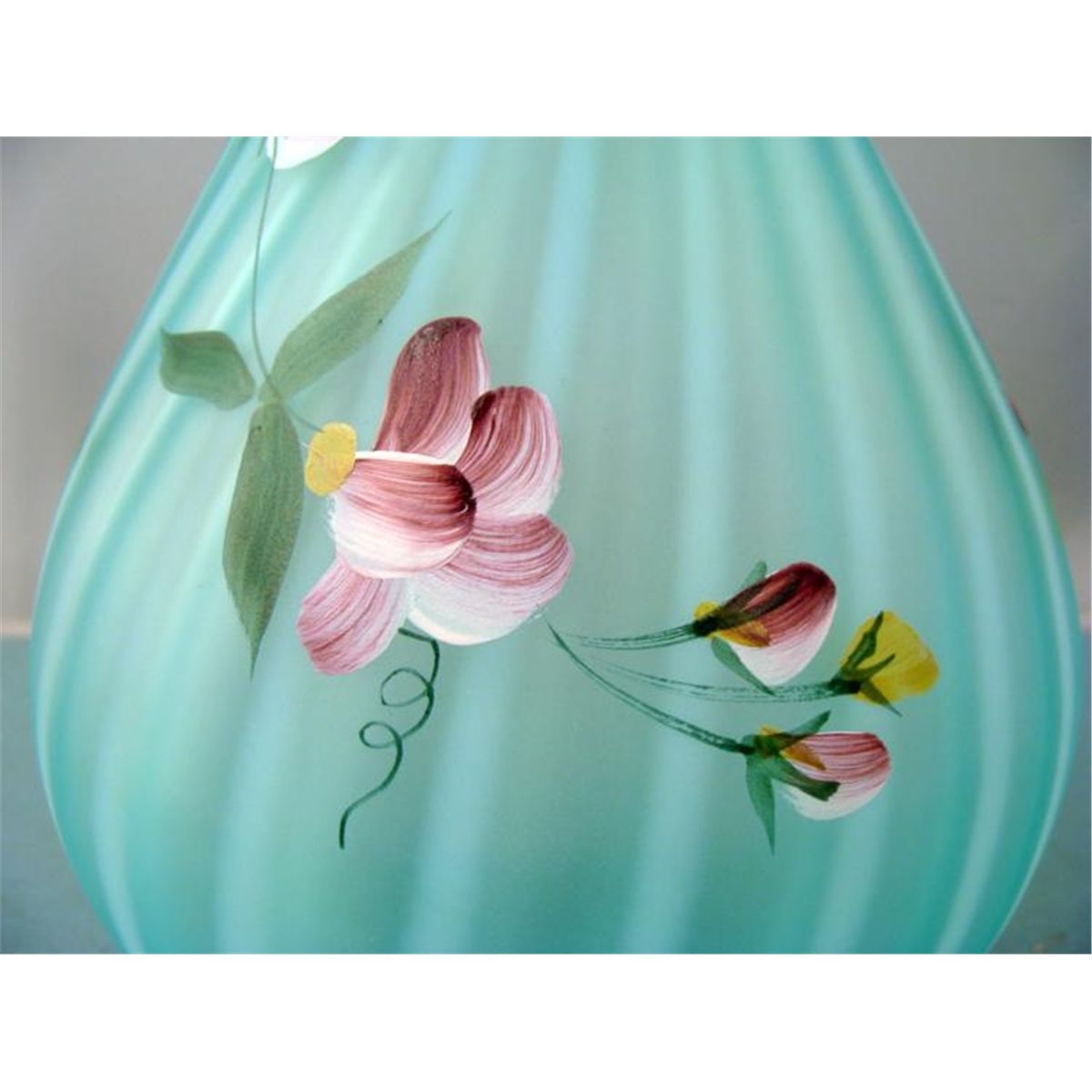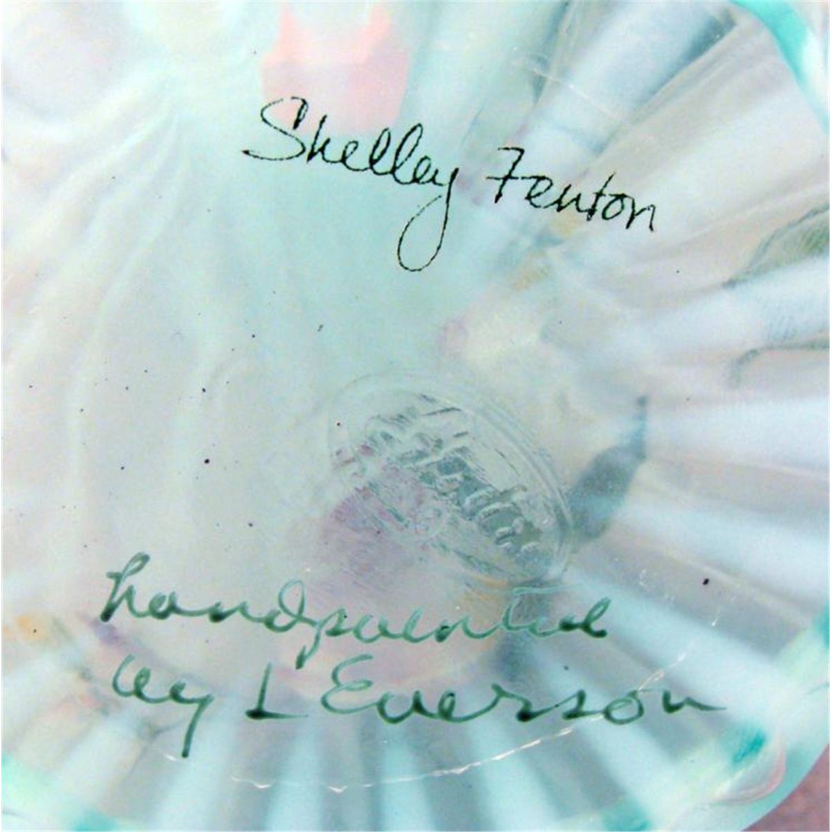 This Fenton Sea Mist Hand Painted Decanter was signed by Bill Fenton's youngest daughter Shelley Fenton, as well as the artist. It features subtle spiral stripes, and was hand painted in pink and purple floral pattern with yellow, and green leaves. It comes with a sea mist color stopper. * Condition: ExcellentSize: 9" tall, 5" in diameterMarkings: Fenton markSignatures: Shelley Fenton; Hand painted by L. EversonYear: 1997