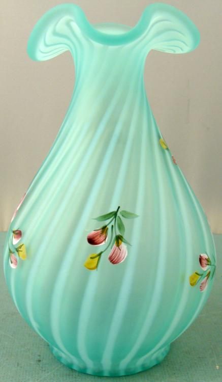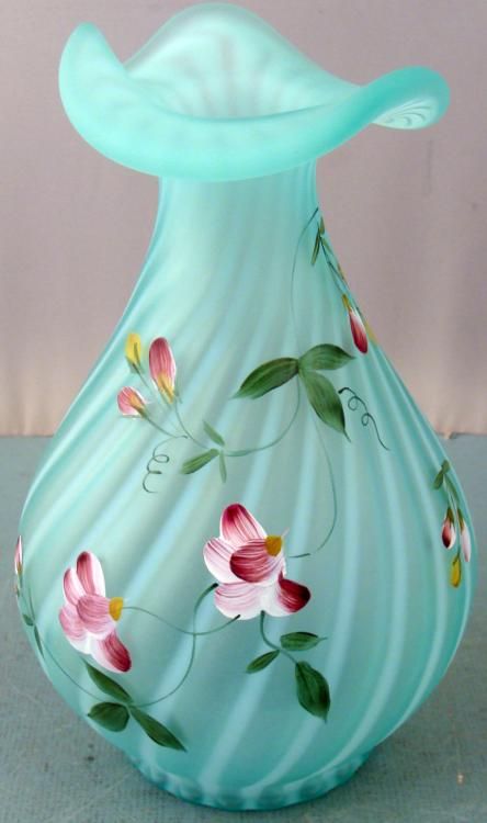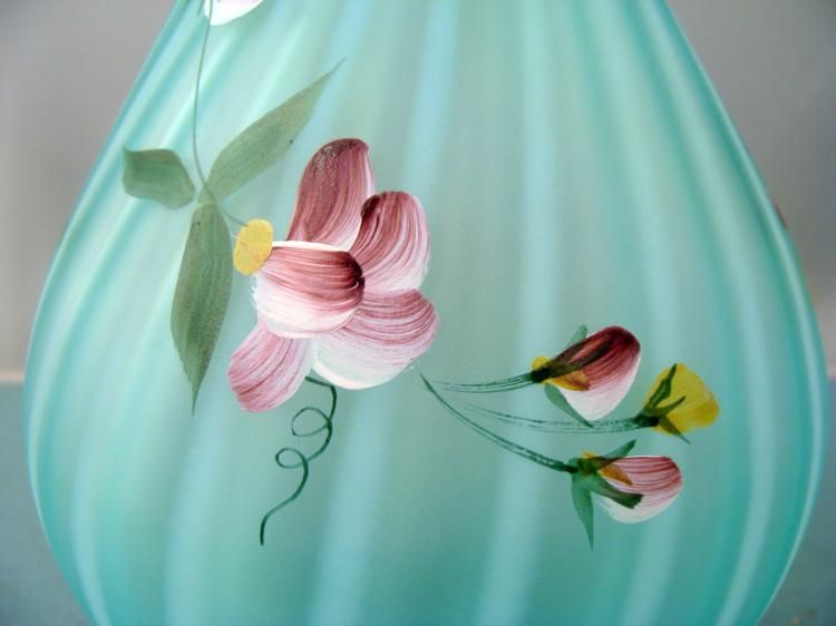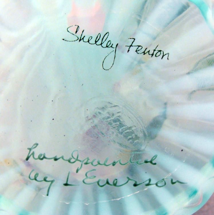 This Fenton Sea Mist Hand Painted Decanter was signed by Bill Fenton's youngest daughter Shelley Fenton, as well as the artist. It features subtle spiral stripes, and was hand painted in pink and purple floral pattern with yellow, and green leaves. It comes with a sea mist color stopper. * Condition: ExcellentSize: 9" tall, 5" in diameterMarkings: Fenton markSignatures: Shelley Fenton; Hand painted by L. EversonYear: 1997